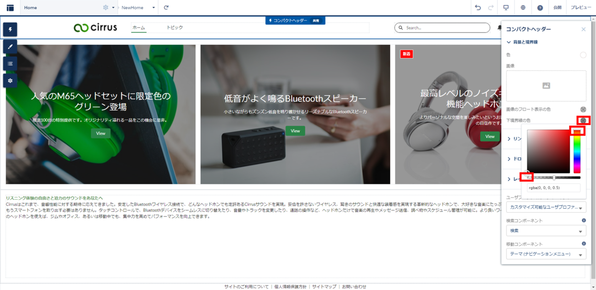 5.コンパクトヘッダーのプロパティをクリックして、"下境界線の色"のアイコンをクリックして、背景色を透明に設定します。