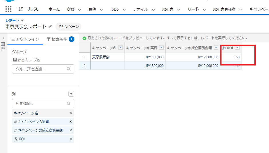 アウトラインの列に「キャンペーンの実費」と「キャンペーンの成立商談金額」を追加し、レポートを保存