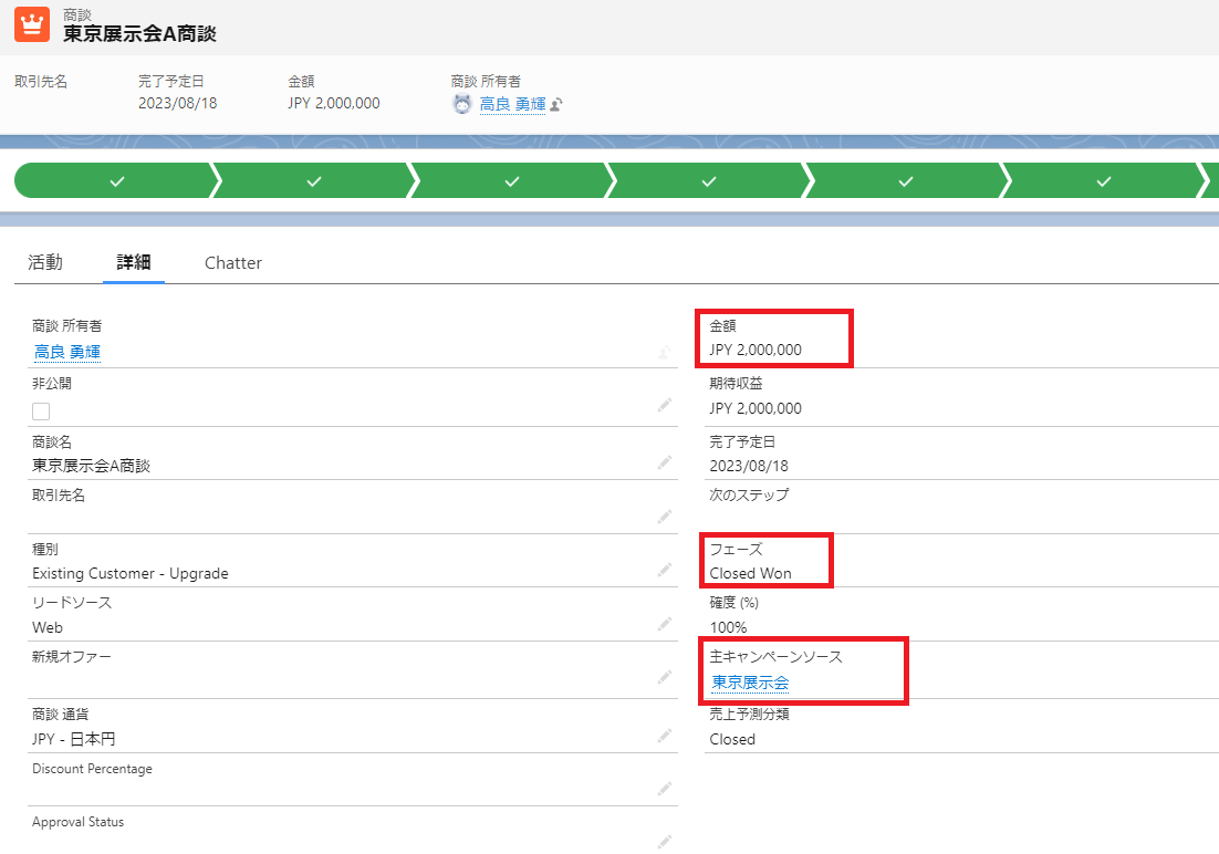 「金額」を入力して、「主キャンペーンソース」に「東京展示会」を設定、「フェーズ」に「Closed won」を設定