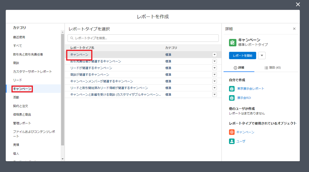 「新規レポート」からカテゴリーを「キャンペーン」で選択し、レポートタイプを「キャンペーン」でレポートを開始
